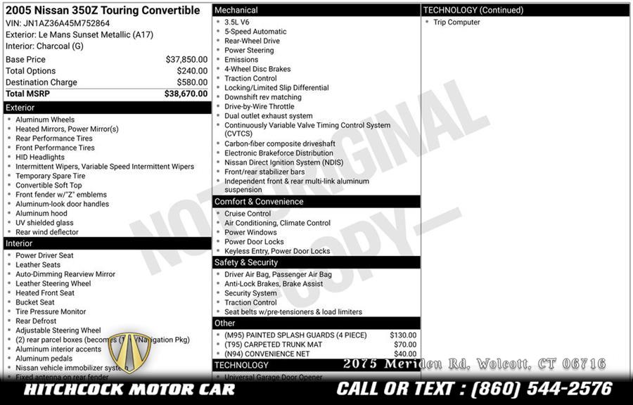 Standard Equipments on 2005 Nissan 350z Touring in Wolcott, CT