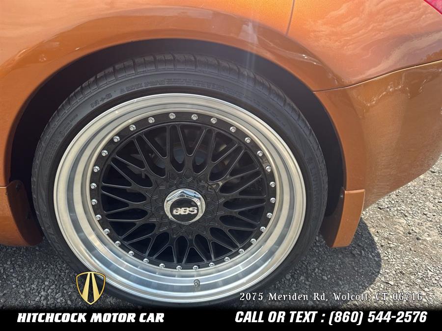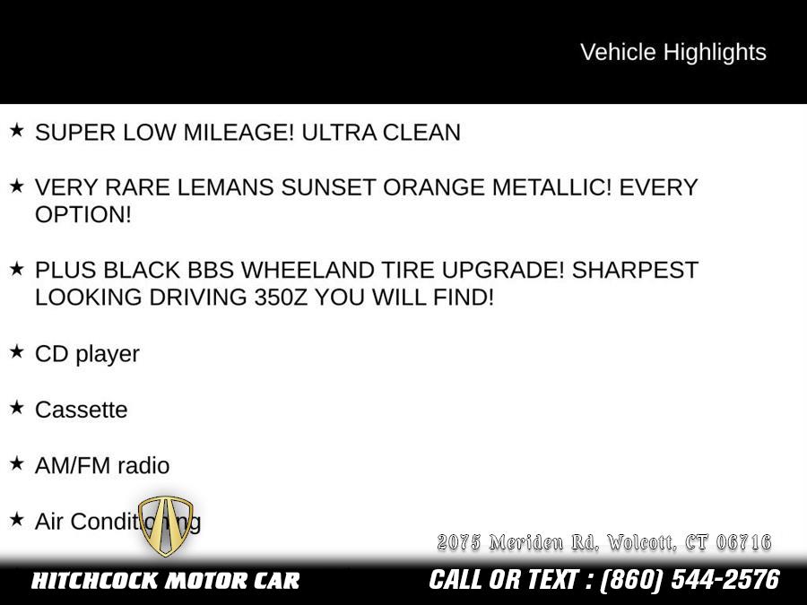 Le Mans Sunset Clearcoat Metallic 2005 Nissan 350Z Touring RWD 5-Speed Automatic Electronic with Overdrive 3.5L V6 DOHC 24V SUPER LOW MILEAGE! ULTRA CLEAN, VERY RARE LEMANS SUNSET ORANGE METALLIC! EVERY OPTION!, PLUS BLACK BBS WHEELAND TIRE UPGRADE! SHARPEST LOOKING DRIVING 350Z YOU WILL FIND!, 350Z Touring, 2D Convertible, 3.5L V6 DOHC 24V, 5-Speed Automatic Electronic with Overdrive, RWD, Le Mans Sunset Clearcoat Metallic, Charcoal Leather, 18" 6-Spoke Alloy Wheels, 4-Wheel Disc Brakes, ABS brakes, Air Conditioning, AM/FM radio, Automatic temperature control, Bose AM/FM Stereo w/In-Dash 6 Disc CD Chngr, Brake assist, Cassette, CD player, Convertible roof lining, Convertible roof wind blocker, Four wheel independent suspension, Garage door transmitter: HomeLink, Glass rear window, Heated Front Sport Bucket Seats, High intensity discharge headlights: Xenon, Illuminated entry, Leather Seat Trim, Leather Shift Knob, Power convertible roof, Power steering, Power windows, Remote keyless entry, Security system, Speed-sensing steering, Tachometer, Tilt steering wheel, Traction control.