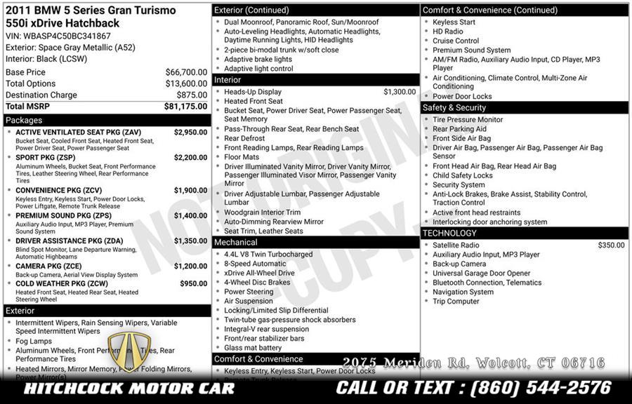Standard Equipments on 2011 BMW 5 Series 550i xDrive Gran Turismo in Wolcott, CT