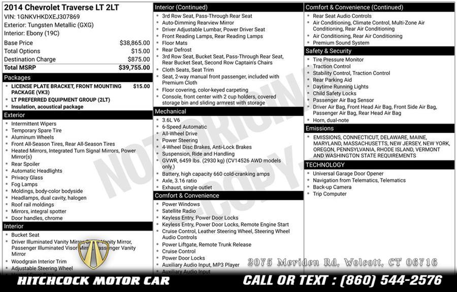 Standard Equipments on 2014 Chevrolet Traverse 2LT in Wolcott, CT