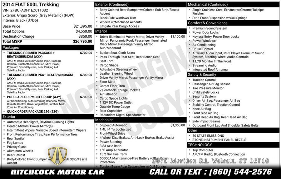 Grigio Scuro (Gray Metallic) 2014 Fiat 500L Trekking FWD 6-Speed C633 Euro Twin Clutch 1.4L I4 16V MultiAir Turbocharged GORGEOUS LITTLE FIAT 500L TREKKING!, THE BEST COLOR COMBO AND ALL POWER OPTIONS!, PERFECT CARFAX WITH NO ACCIDENTS EVER!, 500L Trekking, 4D Hatchback, 1.4L I4 16V MultiAir Turbocharged, FWD, Grigio Scuro (Gray Metallic), 17" Aluminum Wheels, Air Conditioning, AM/FM radio, Beats Premium Audio System (FLEET)(DISC), Brake assist, Front Bucket Seats, Illuminated entry, Leather steering wheel, Media Hub (SD, USB, AUX), Nav-Capable See Dealer for Details, ParkSense Rear Park Assist System, ParkView Rear Back-Up Camera, Passenger door bin, Power door mirrors, Power Sunroof (DISC), Power windows, Premium Cloth Low-Back Bucket Seats, Quick Order Package 22G, Radio: Uconnect 6.5A AM/FM/BT/Voice, Remote keyless entry, SIRIUSXM Satellite Radio, Spoiler, Stone Instrument Panel Bezels, Stone Instrument Panel Bezels (DISC), Sun Visors w/Illuminated Vanity Mirrors, Tachometer, Telescoping steering wheel, Tilt steering wheel, Trekking Premier Package (DISC), Trekking Premier Package + Beats/SiriusXM (DISC).