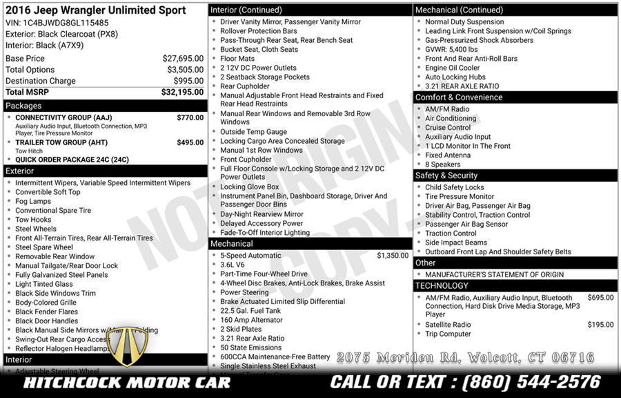 Standard Equipments on 2016 Jeep Wrangler Unlimited Sport in Wolcott, CT