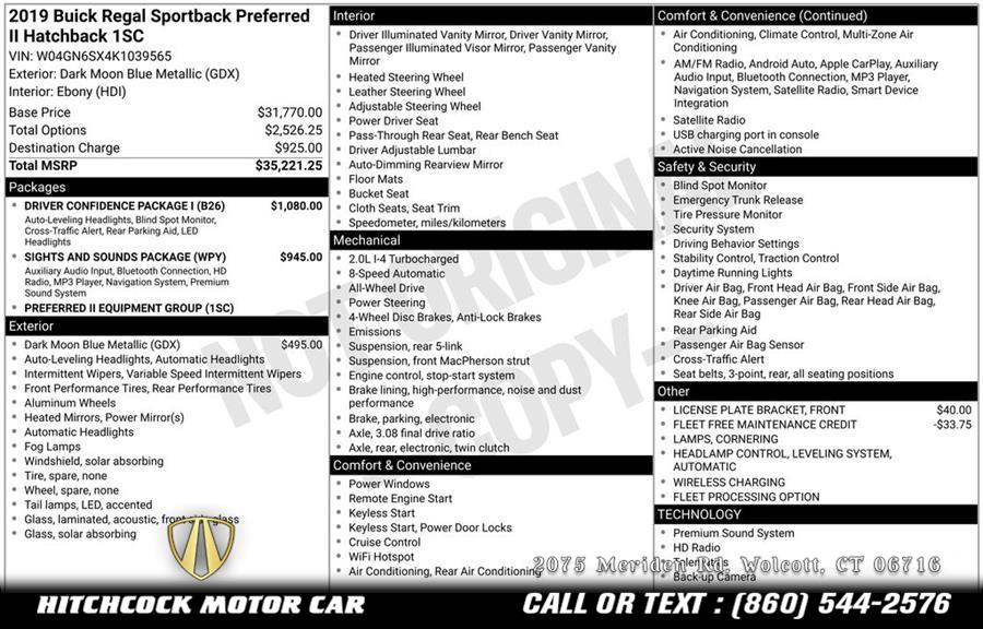 New Price! Priced below KBB Fair Purchase Price! Dark Moon Blue Metallic 2019 Buick Regal Preferred AWD 8-Speed Automatic 2.0L 4-Cylinder DGI DOHC VVT Turbocharged Regal Preferred, 4D Hatchback, 2.0L 4-Cylinder DGI DOHC VVT Turbocharged, 8-Speed Automatic, AWD, Dark Moon Blue Metallic, Ebony w/Ebony Accents w/Leather-Appointed Seat Trim, 2-Way Adjustable (Up/Down) Front Head Restraints, 2-Way Power Driver Lumbar Control Seat Adjuster, 4-Wheel Disc Brakes, 6-Way Manual Front Passenger Seat Adjuster, 7 Speakers, 8-Way Power Driver Seat Adjuster w/Recline, ABS brakes, Air Conditioning, AM/FM radio: SiriusXM, Apple CarPlay/Android Auto, Automatic Leveling System Headlamp Control, Automatic temperature control, Cornering Lamps, Delay-off headlights, Driver Confidence Package I, Enhanced 7-Speaker Audio System Feature, Front Bucket Seats, Front dual zone A/C, Front fog lights, Fully automatic headlights, HD Radio Audio System, Heated door mirrors, Heated steering wheel, Illuminated entry, Lane Change Alert w/Side Blind Zone Alert, LED Headlamps, Outside temperature display, Power door mirrors, Power driver seat, Power windows, Preferred Equipment Group 1SC, Radio: Buick Infotainment AM/FM/SiriusXM Stereo, Radio: Buick Infotainment w/AM/FM/SiriusXM & Nav, Rear Cross-Traffic Alert, Remote keyless entry, Security system, Sights & Sounds Package, SiriusXM Radio, Split folding rear seat, Steering wheel mounted audio controls, Ultrasonic Rear Park Assist w/Audible Warning, Wheels: 18" Machine-Faced Aluminum, Wireless Charging.