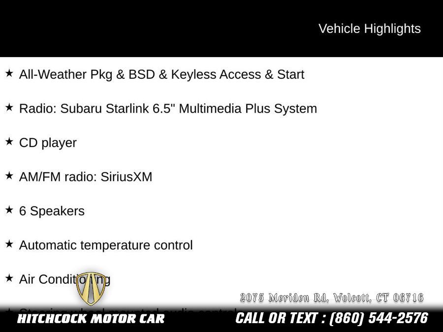 • 6 Speakers, AM/FM radio: SiriusXM, CD player, Radio: Subaru Starlink 6.5" Multimedia Plus System, Air Conditioning, Automatic temperature control, Power driver seat, Power windows, Remote keyless entry, Steering wheel mounted audio controls, 4-Wheel Disc Brakes, ABS brakes, Keyless Access w/Push-Button Start, Brake assist, Electronic Stability Control, Exterior Parking Camera Rear, Fully automatic headlights, Panic alarm, Security system, Speed control, Heated Exterior Mirrors, Blind Spot Detection w/Rear Cross Traffic Alert, Front reading lights, Illuminated entry, Outside temperature display, Overhead console, STARLINK/Apple CarPlay/Android Auto, Tachometer, Telescoping steering wheel, Tilt steering wheel, Cloth Upholstery, Front Bucket Seats, Heated Front Seats, Wheels: 17" x 7.0J Black Machine Finish Alloy, Windshield Wiper De-Icer