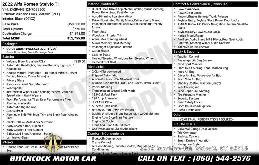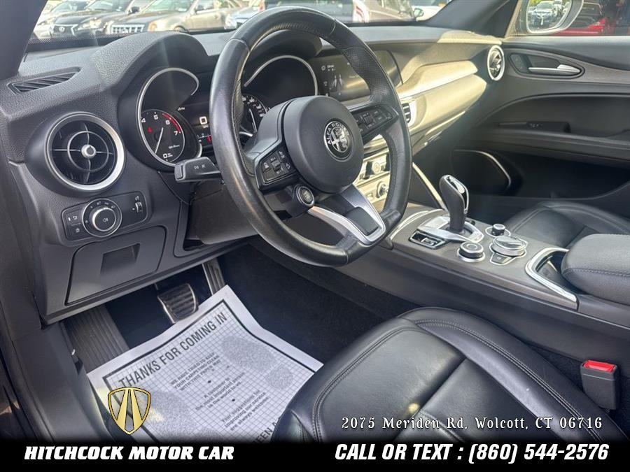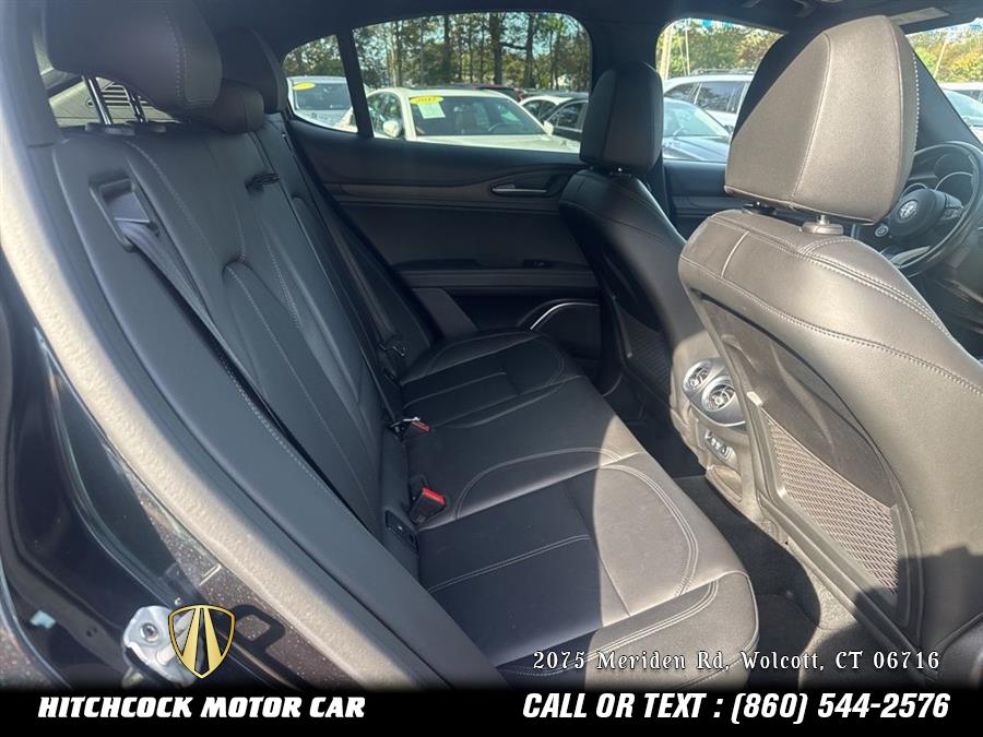 Vulcano Black Metallic 2022 Alfa Romeo Stelvio Ti AWD 8-Speed Automatic I4 1 OWNER LOCAL NEW CAR TRADE IN - NOT FROM AUCTION!, THIS ALFA IS LIKE NEW INSDIE AND OUT! REAT SEATS NEVER SAT IN!, TI PACKAGE AND ALL FACTORY OPTIONS!, VULCANO BLACK MET OVER BLACK TUSCANY ITALY LEATHER!, FREE CHICKEN PARM SANDWICH WITH THE PURCAHSE!, Stelvio Ti, 4D Sport Utility, I4, AWD, Vulcano Black Metallic, Black Leather, 4-Wheel Disc Brakes, 8 Speakers, ABS brakes, Air Conditioning, AM/FM radio: SiriusXM, Apple CarPlay/Android Auto, Auto High-beam Headlights, Automatic temperature control, Delay-off headlights, Four wheel independent suspension, Front Bucket Seats, Front dual zone A/C, Fully automatic headlights, Garage door transmitter, Genuine wood console insert, Genuine wood dashboard insert, Genuine wood door panel insert, Headlight cleaning, Heated front seats, Heated rear seats, Heated steering wheel, High intensity discharge headlights: Bi-Xenon, Illuminated entry, Leather Seats, Leather Shift Knob, Leather steering wheel, Memory seat, Navigation System, Outside temperature display, ParkView Rear Back-Up Camera, Power 6-Way Adjustable Driver Seat, Power 6-Way Front Passenger Seat, Power driver seat, Power Liftgate, Power moonroof, Power passenger seat, Power windows, Quick Order Package 22G Ti, Radio: AM/FM/HD 8.8" w/Navigation, Rain sensing wipers, Remote keyless entry, Silver Ti Badge, Speed-sensing steering, Split folding rear seat, Spoiler, Sport steering wheel, Steering wheel mounted audio controls, Tachometer, Telescoping steering wheel, Tilt steering wheel, Vesuvio Gray Body Kit, Wheels: 19" x 8.0" Sport 5-Hole Aluminum.
